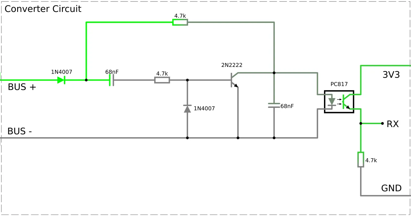 To convert the signal on the bus to UART that can be received by the ESPHome device, a converter circuit is needed. This circuit must apply a lowpass filter to the signal and convert the voltage to a safe level for the ESPHome device.